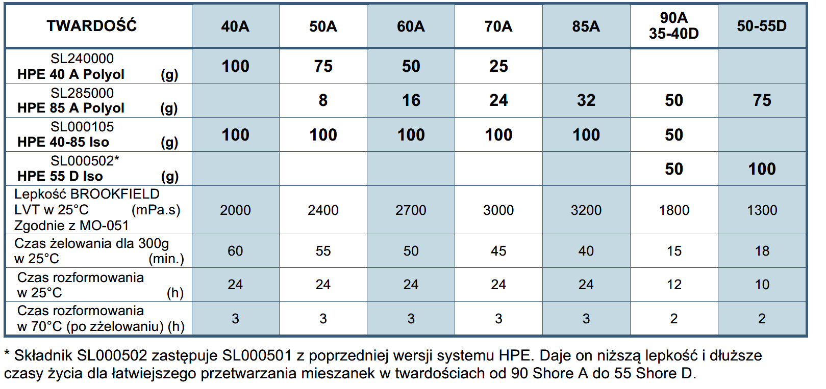 Z zastosowaniem pozostałych składników systemu (HPE 40-85 Isocyanian i/lub HPE 85 A Polyol) pozwala na uzyskanie twardości od 40 do 85 Shore A. Składniki należy zakupić oddzielnie.