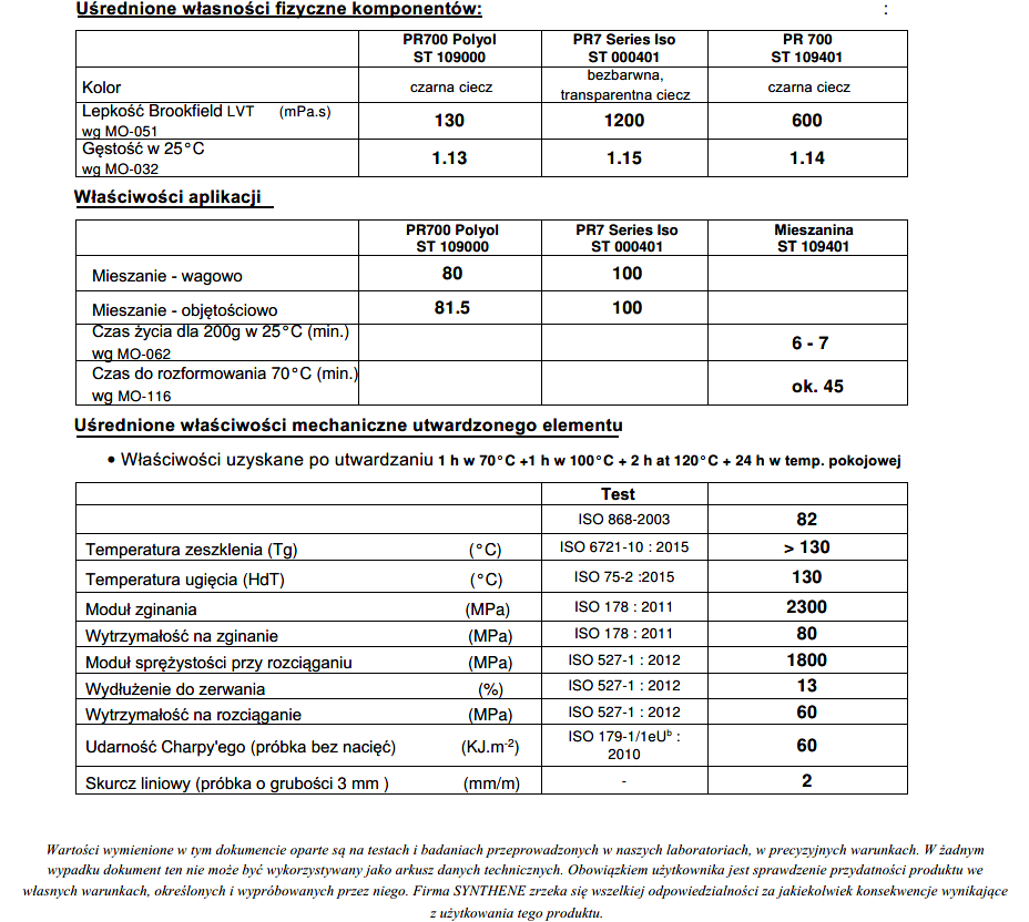 Po utwardzeniu PR700 ma własności mechaniczne np. wydłużenie przy zerwaniu, wytrzymałość na zginanie i odporność na uderzenia, identyczne z własnościami typowych ABS.