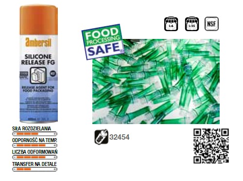 - Odpowiedni do stosowania jako środek antyadhezyjny do form (NSF M1) i zapobiegający przywieraniu w maszynach pakujących (NSF H1) tam, gdzie gotowy produkt będzie miał bezpośredni kontakt z żywnością